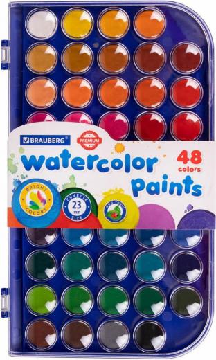 Brauberg Краски акварельные сухие "PREMIUM" 48 цветов, круглые кюветы 23 мм, пенал, 191747