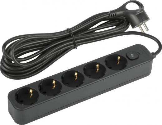 Intro Сетевой фильтр SFE550-B с заземлением, с выключателем, 5 розеток, провод 5 м, ПВС 3x0,75мм2. Базовый уровень защиты техники: от импульсных помех